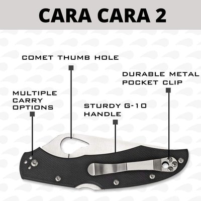 TheCara Cara2 with a G-10 handle has a full-flat ground high performance 8Cr13MoV blade. Shaped like a "comet", the hole in the blade symbolizes quality and careful manufacturing tolerances.