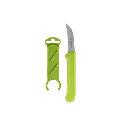 A "reverse" curved blade makes this knife ideal for creating detailed decorations and preparation for small, round vegetables and fruits. Includes a matching plastic sheath for chefs on-the-go and storage protection.