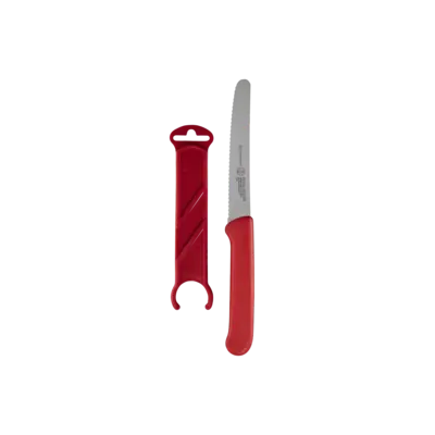 The 4.5" Serrated Tomato Knife is one of our most popular specialty knives! This knife slices food that has a tough exterior and a softer middle, such as tomatoes or salami, with ease. It includes a plastic sheath for on-the-go and storage protection.