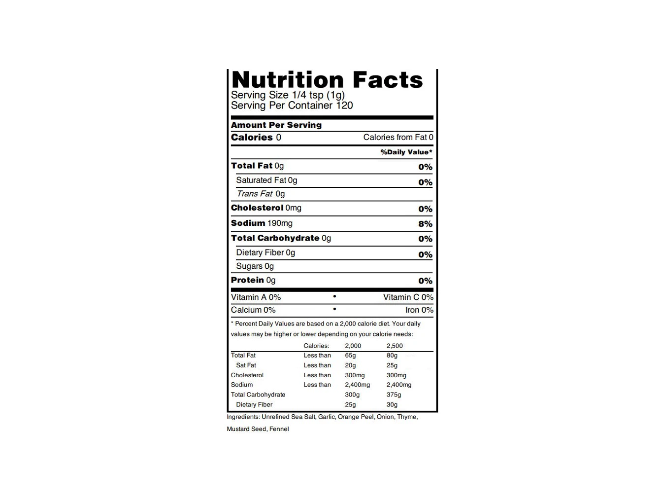 Ingredients: Unrefined sea salt, garlic, orange peel, onion, thyme, mustard seed, fennel