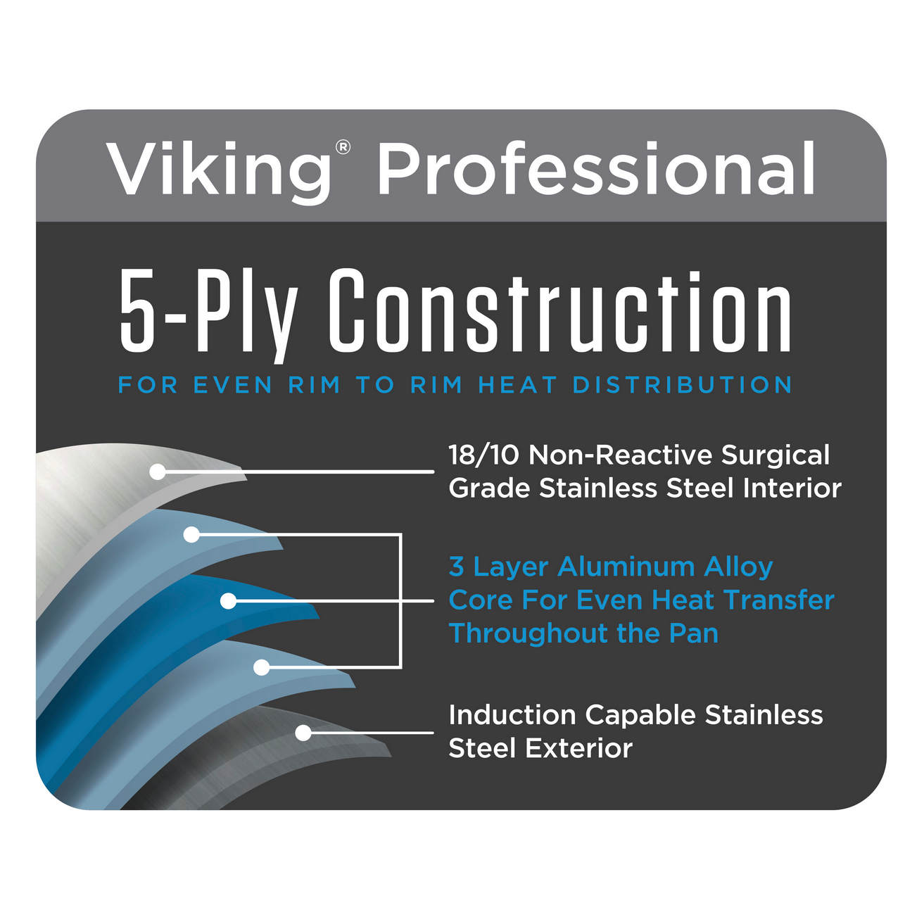 Viking 5-Ply Professional Cookware provides commercial grade quality for in-home use. With an elegant satin finish and five layers of metal, this premium line of cookware is specially handcrafted in the USA.