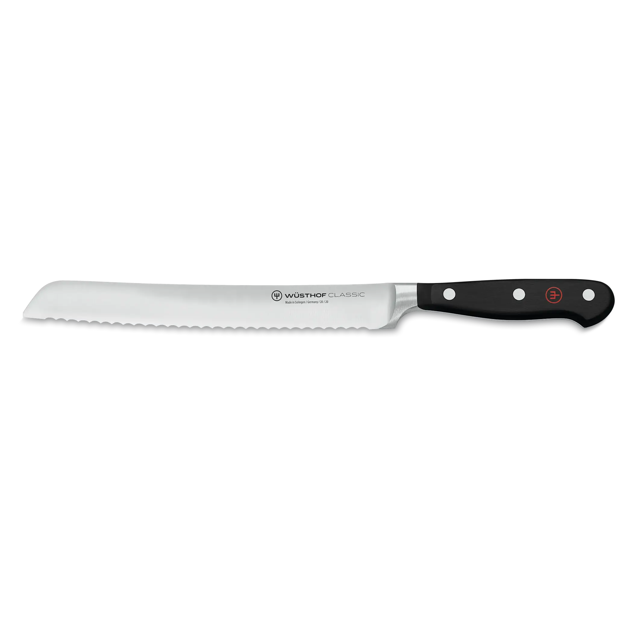 The CLASSIC 8" Bread Knife slices through bread or baguettes with minimal crumbs. The serrations along the edge help guide the blade through tough crust without compressing the soft inside.