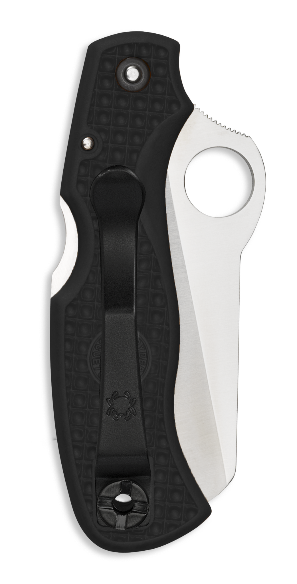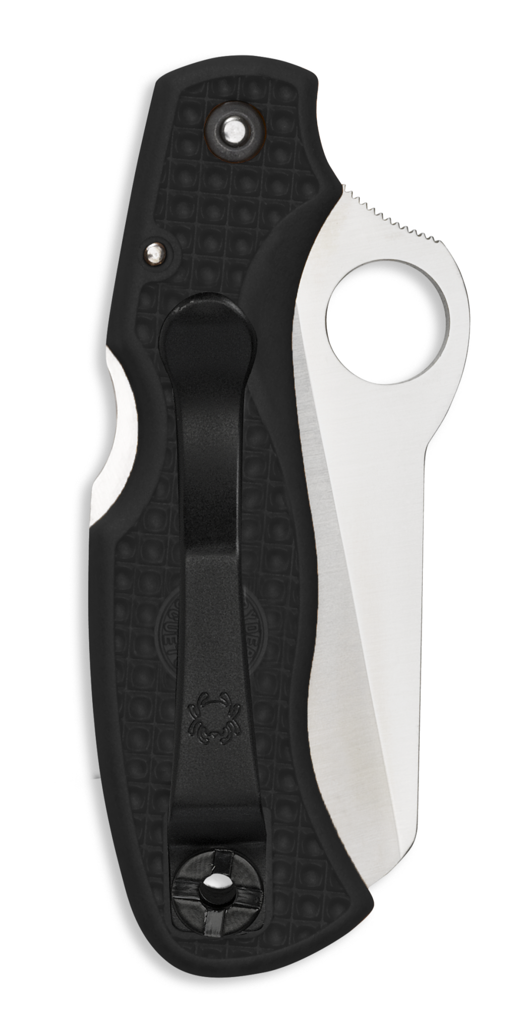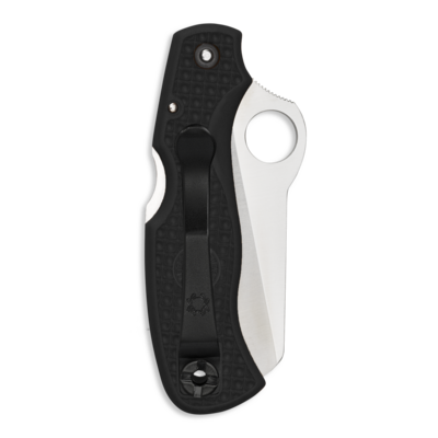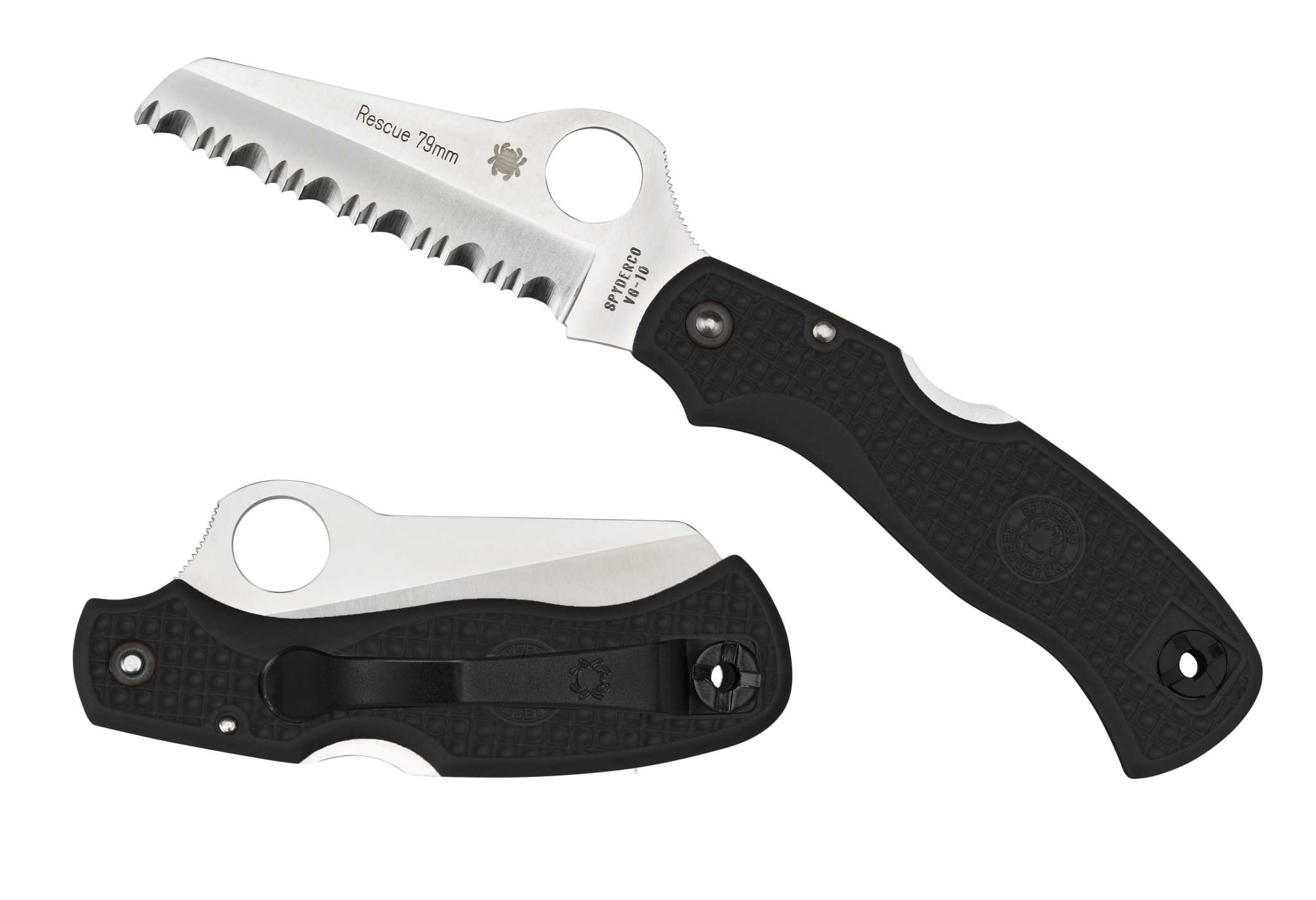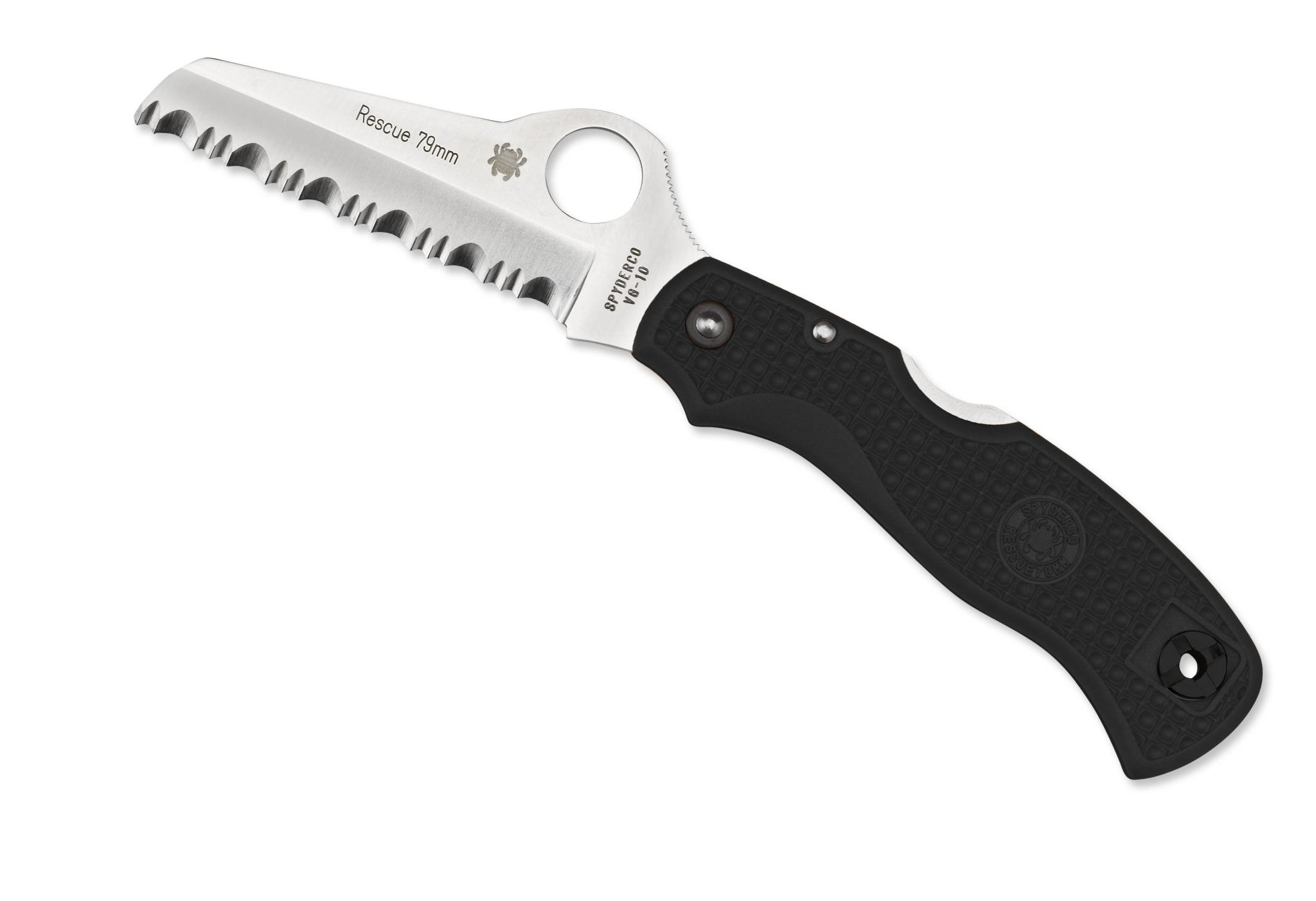 A smaller equivalent of the C14 93mm Rescue, it too has a flat saber-ground, SpyderEdge, VG-10 blade that ends in a sheepfoot safety tip. For smoother thumb rotation we enlarged the Spyderco Trademark Round Hole, which in turn creates a prominent hump to position the thumb on while cutting. The FRN waffle textured handle is available in indigo blue, black and safety orange with an ambidextrous, tip-up pocket clip.