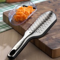 The Microplane Elite Series includes a transparent cover that doubles as a grating catch feature and measuring cup with a generous 1-cup capacity. Use the stainless steel Microplane® ribbon blade to grate soft-medium cheeses (Gouda, Cheddar, Colby, Monterey Jack), chocolate, butter, apples, carrots, potatoes, radishes, zucchini and onion. The grated results are thin strips of shavings which makes cheese melty! The ribbon blade is a 2-way grater which grates in both directions, saving you effort and time.
