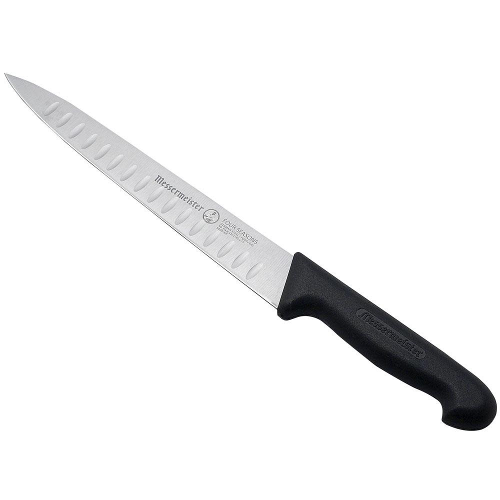 The Messermeisters Four Seasons 8" Carving Knife features a stamped, long, and straight blade for smooth, even slicing. The alternating kullenschliffs on each side of the knife reduce drag and prevent food from sticking to the blade.