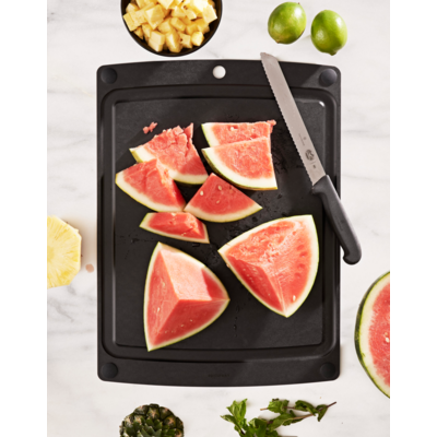 Epicurean All-in-One Cutting Boards utilize both sides of the board - use the juice groove side to catch excess liquids, or flip the board over if you need even more space. The four non-slip silicone feet keep the board secure either way.