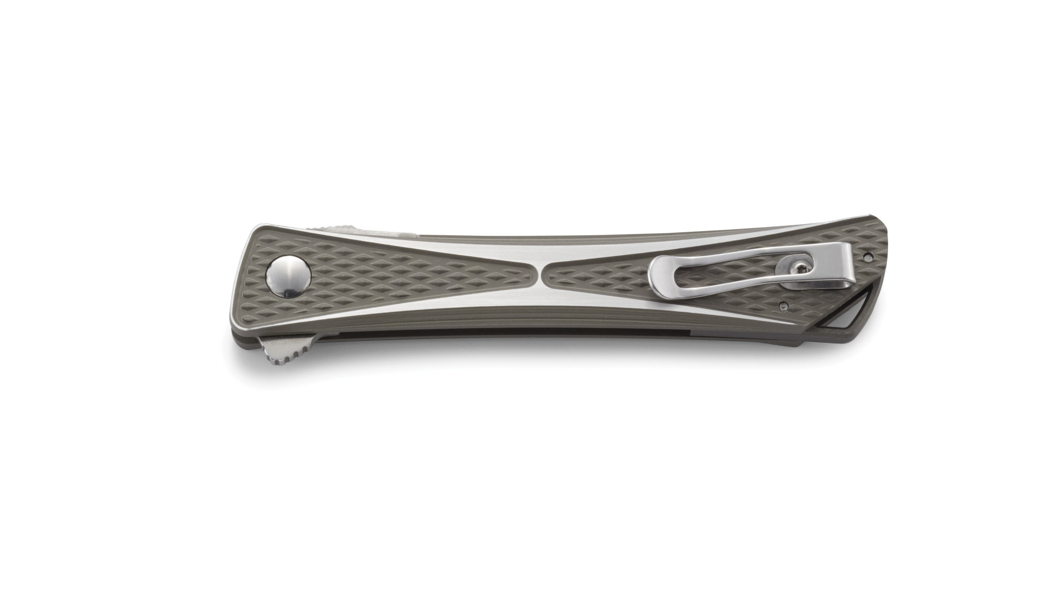 The slim blade features a full flat grind and is deployed swiftly and smoothly with an IKBS™ Ball Bearing Pivot System. The brushed aluminum two-tone handle, when closed, resembles the shape of a dog bone and gives the Crossbones its name.