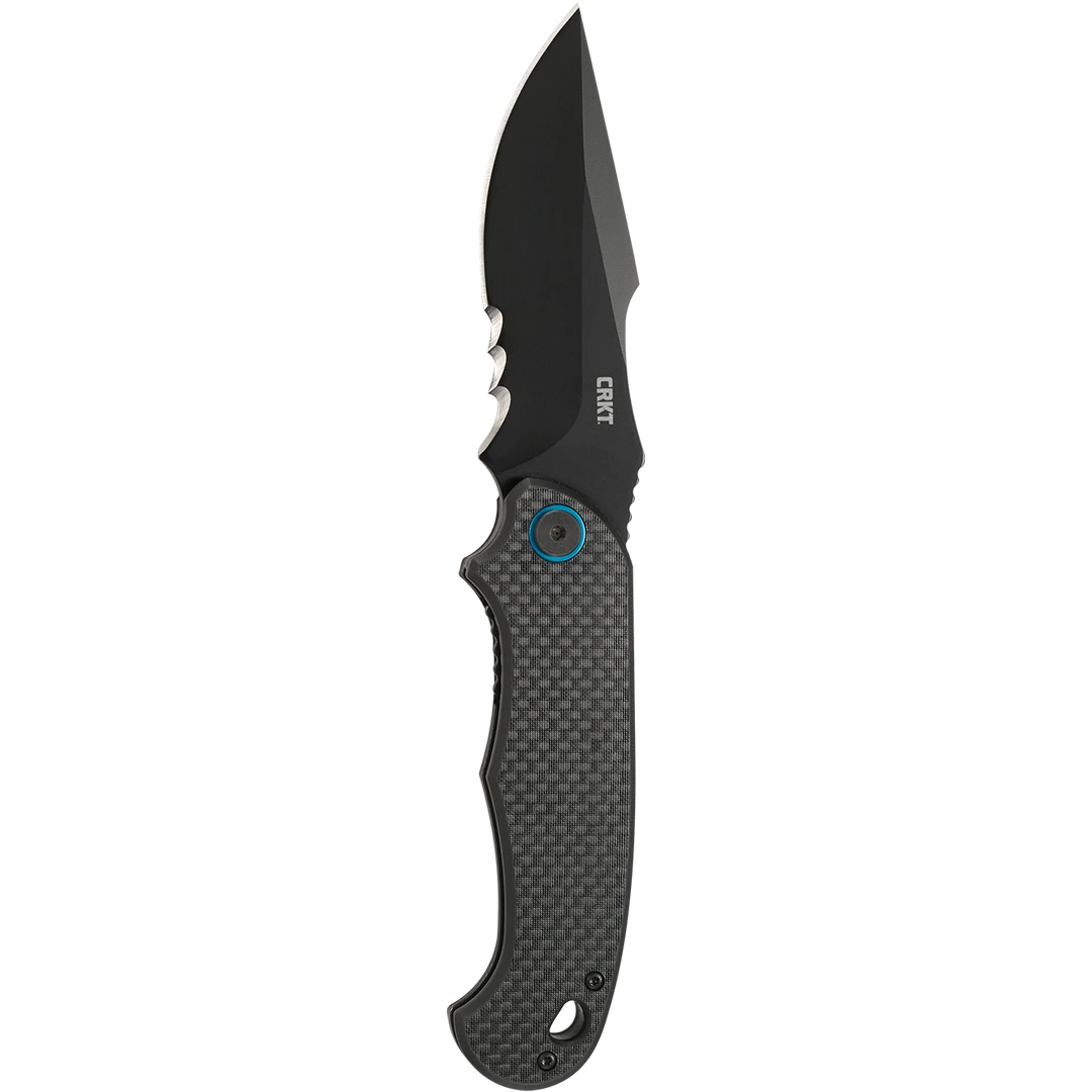 The impossible-to-miss re-curve of the blade performs when making deep cuts and slicing, the Veff Serrations™ breezes through rope and cord, while the double grind makes pushing more efficient. The surprisingly compact G10 and carbon fiber handle accommodates a solid four-finger grip and is finished with an electric blue pivot and pocket clip.