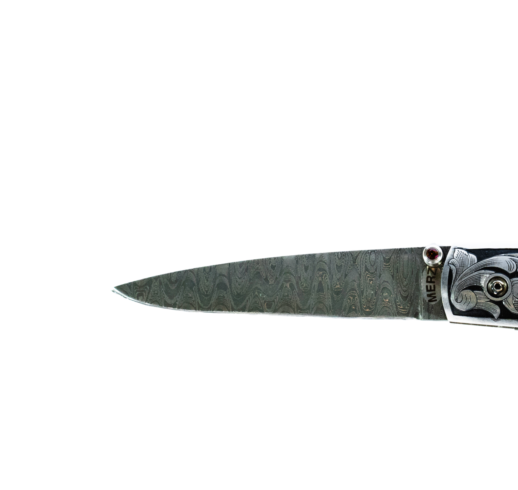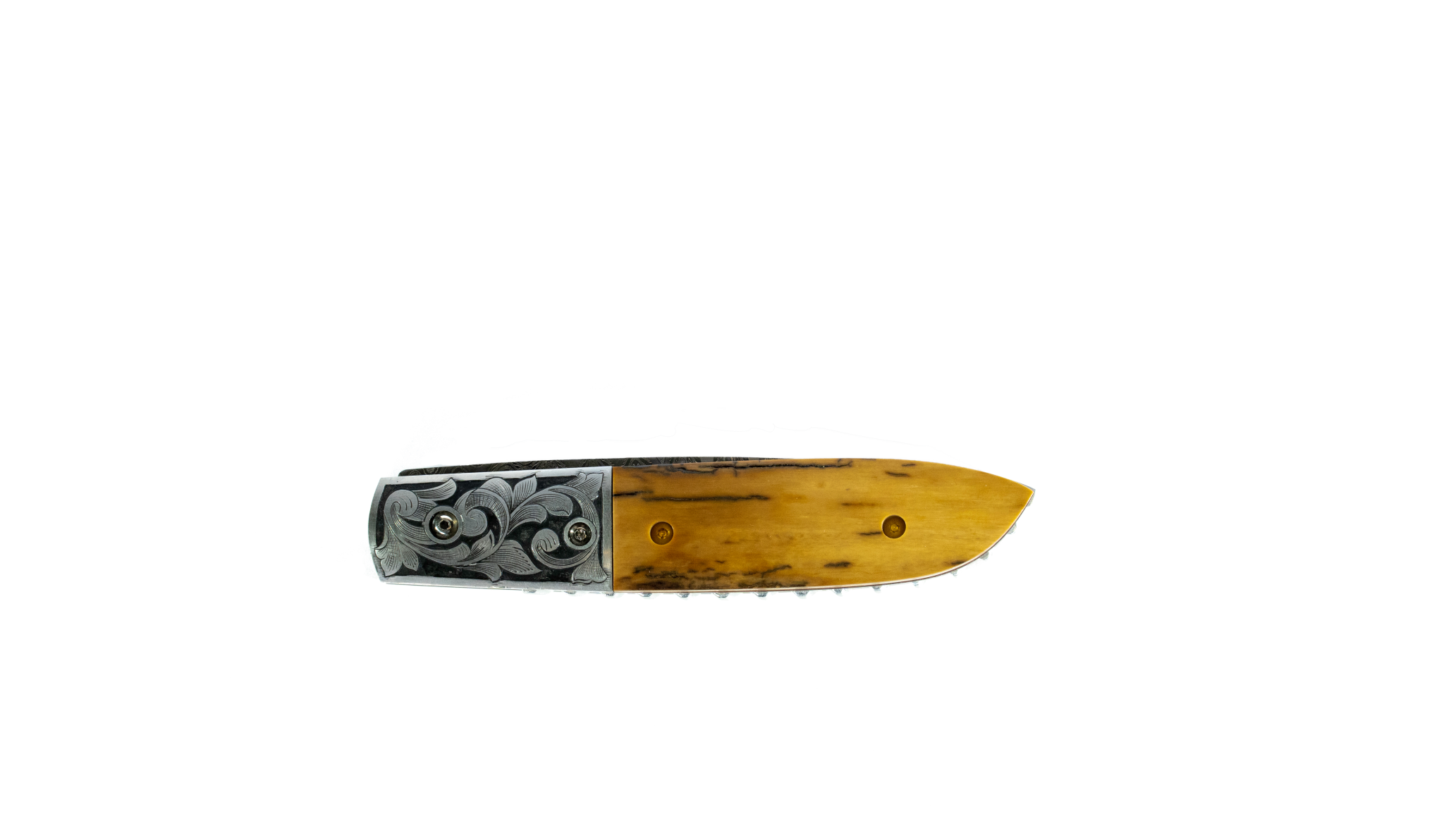 Johnny Stout Compadre Folder, Turkish Twist Damascus, Mammoth Ivory, Hand engraved by Dale Bass