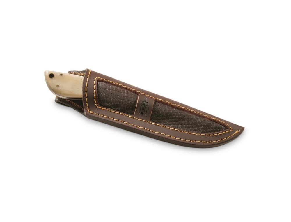 This drop point hunter has a Damascus blade with full tang construction. Blade is 3/16" thick and 1 3/8" deep. Filework on thumbrest. Bolster is walnut and handle is camel bone with brass pins. Lanyard hole in handle. Comes with leather sheath.