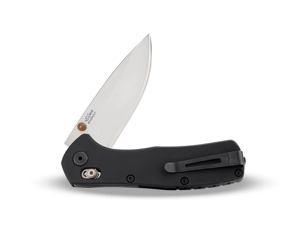 Satin finished drop point Magnacut blade with black anodized aluminum handle and tumble polished stainless steel liners