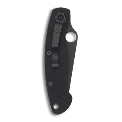 To create an even more subdued blade we have blackened the blade with a DLC black matte coating. Since the steel is the spirit of the knife, CPM S30V seemed the logical choice for the blade given its reputation for long-term edge retention and rust resistance. The 'Millie' has a modified clip-point blade coated in non-reflective black then laser cut with a 14 mm Spyderco Round Hole for quick deployment and for use with gloves. Texturing above the hole holds the thumb in contact with the blade's spine during cutting for confident control over the sharpened edge. The handle scales are G-10 with the lock's liner nested directly into the scale, pumping up lock strength without the addition of bulky liners. Spacers between the scales create a gap running the handle's full length exposing the inside workings for inspection and cleaning. The handle flares slightly at the front end creating a finger choil and at the butt end, which keeps the knife from slipping forward or backward in the hand while sawing or making tough or aggressive cuts. A contoured black metal clip is set for right-hand tip-down carry.