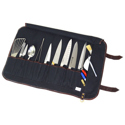 It has 9 slots for knives and tool and can hold a knife with an overall length of 15”(38 cm). When unrolled each knife bag has an overall dimension of 20.5” x 18” (52 cm x 46 cm).