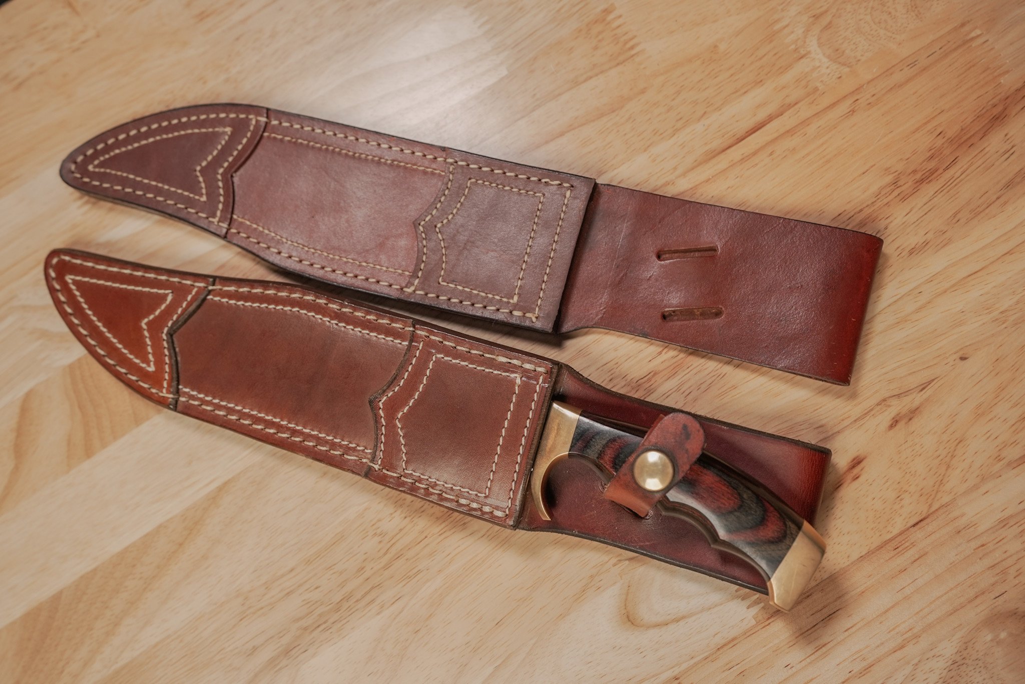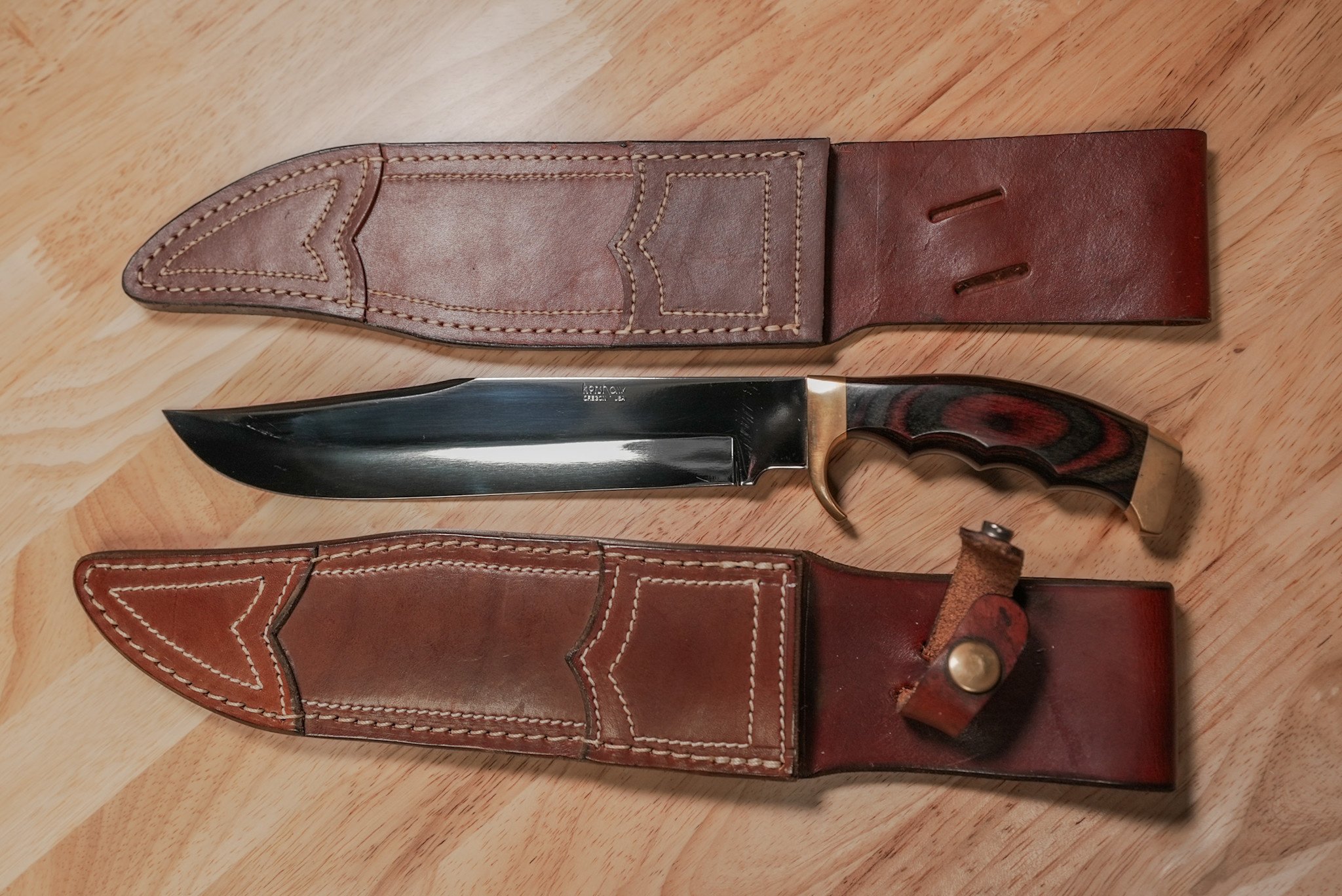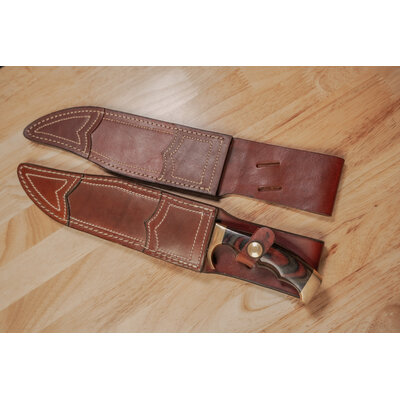 A consignment item from a personal collection. This is a Kershaw, Dan Harrison Bowie knife, it comes with the original sheath as well as a new custom sheath.