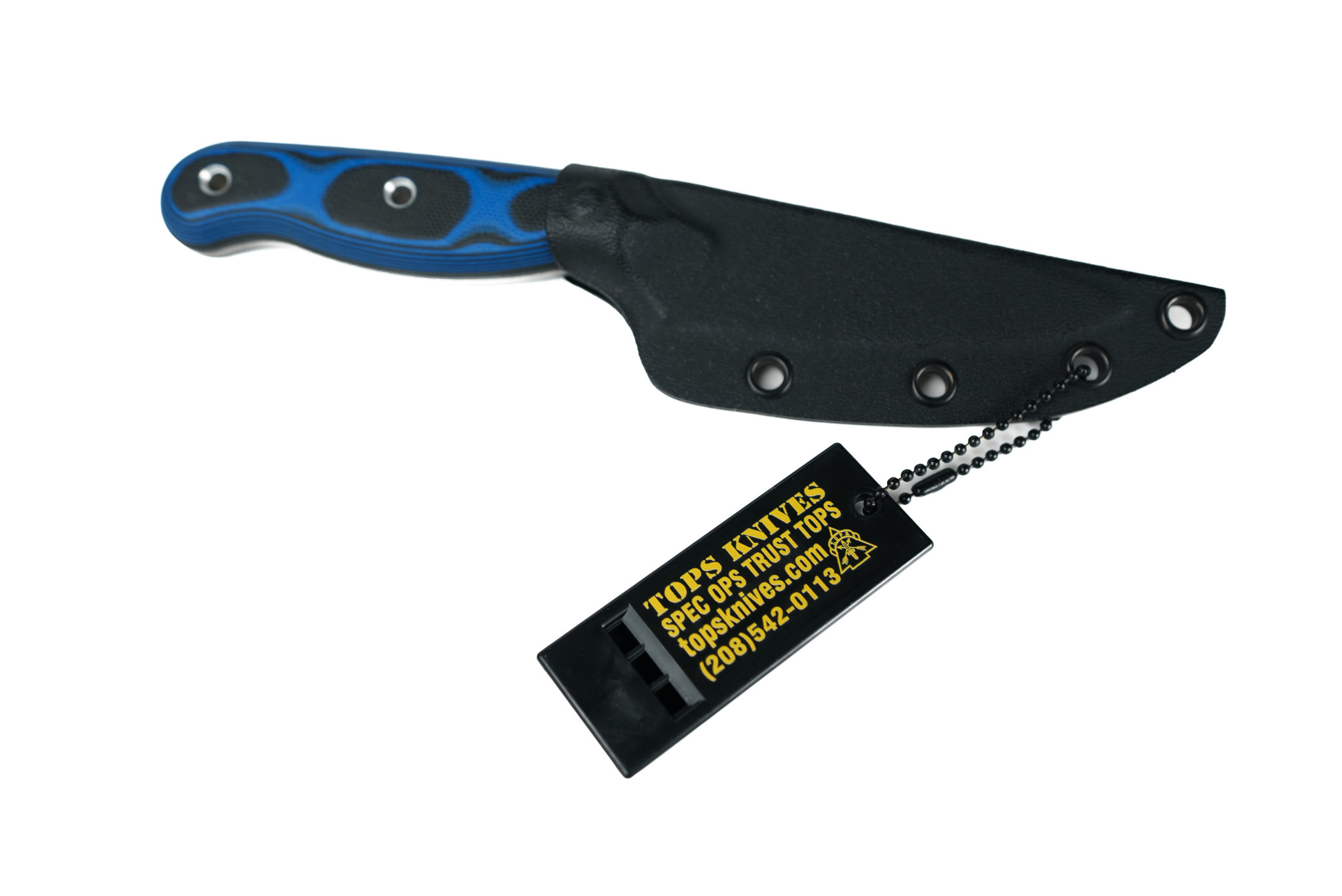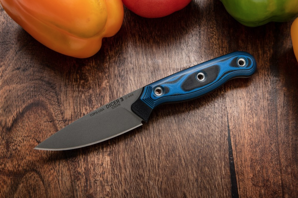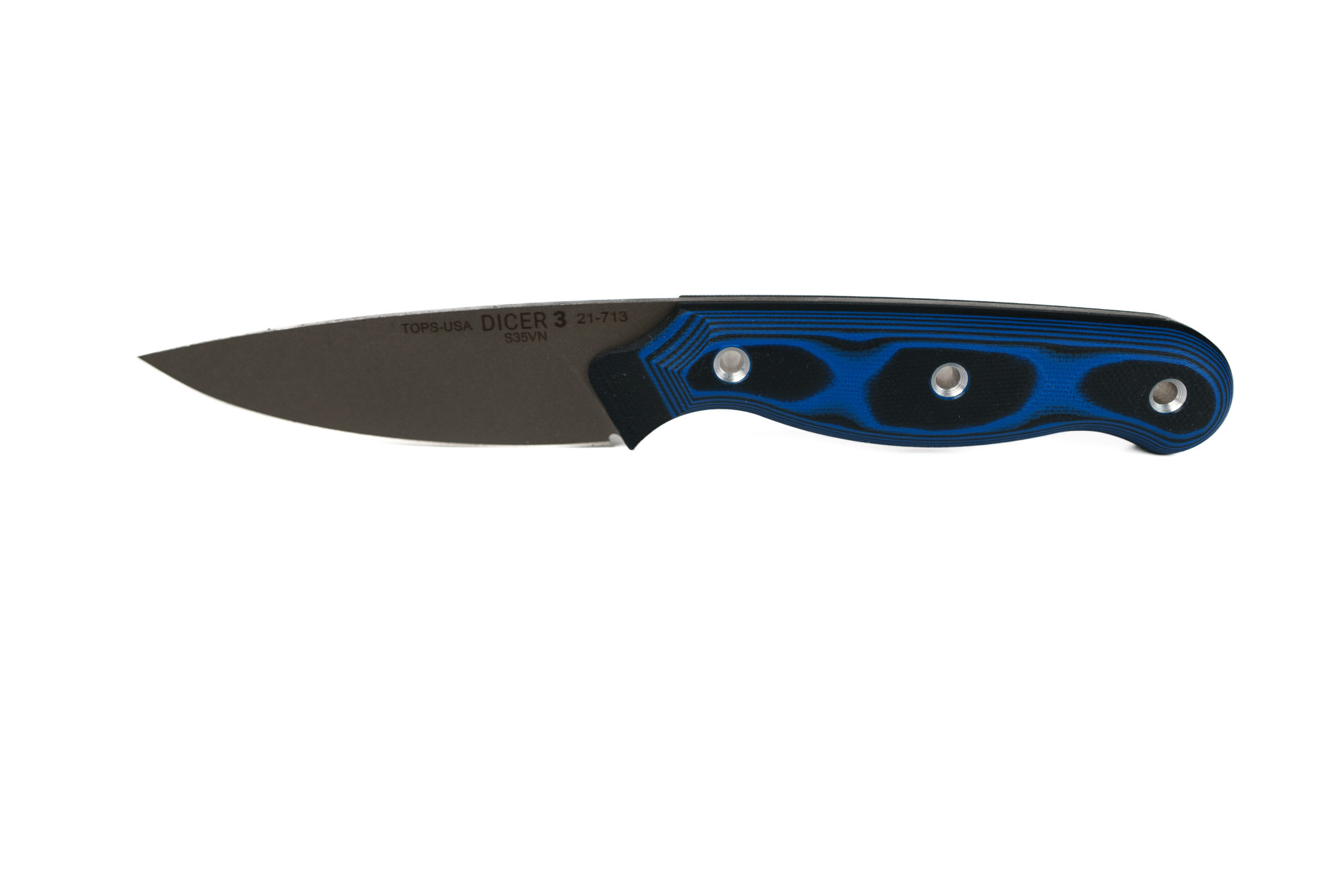 Bring the quality of TOPS Knives into the kitchen with their Dicer series. These knives feature CPM S35VN steel and a blue and black Micarta and G-10 handle. Includes a black Kydex sheath.