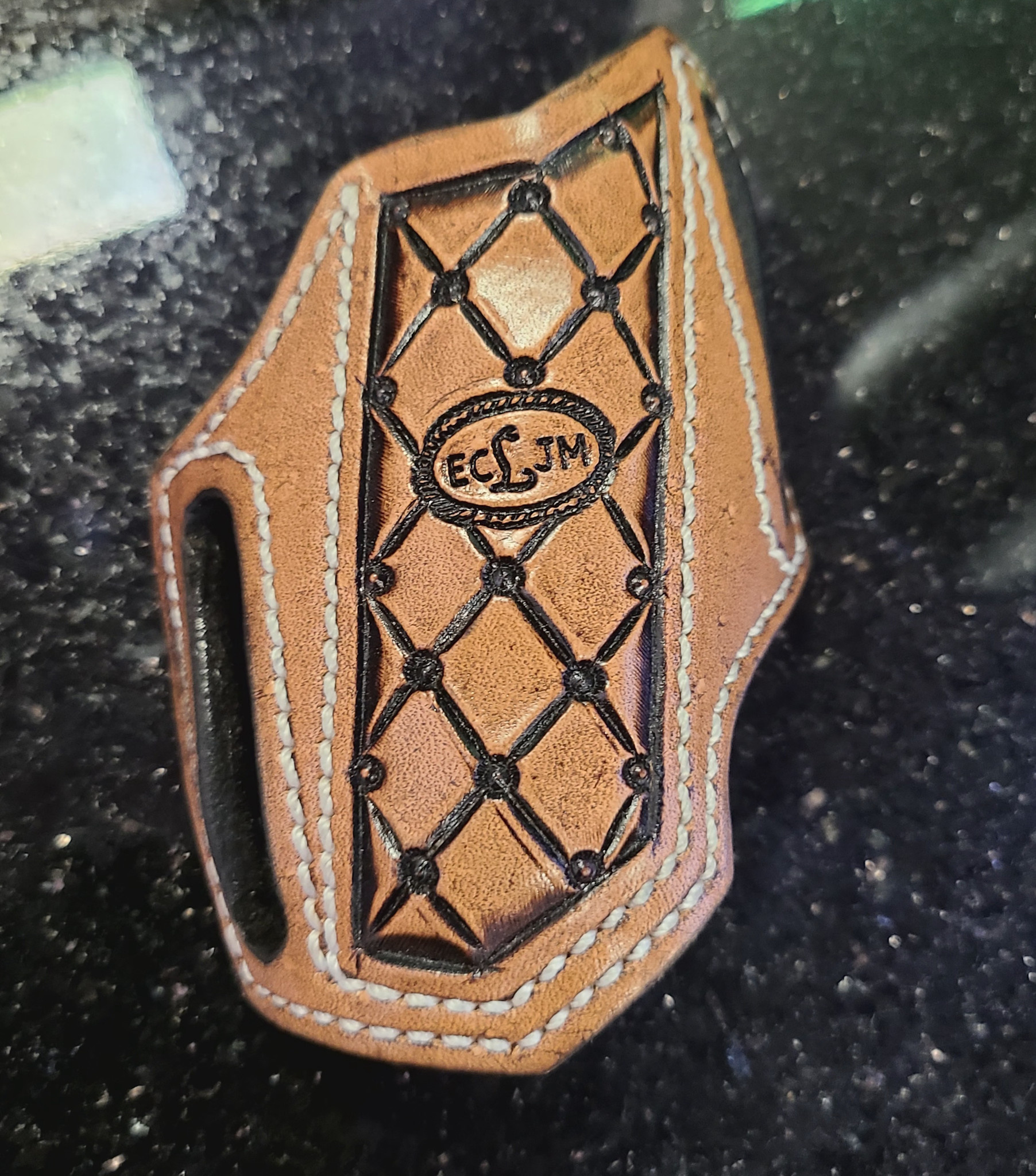 Tooled ECLJM Angled Trapper Sheath Light Tan Dotted