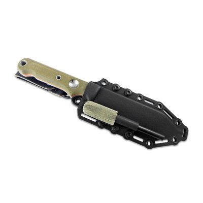 Atop the blade is a notch for efficient striking of a ferro rod and one is included with each knife. Features a polished stainless steel divot for use with a fire bow. This is a well-designed, great looking, and robust knife intended for serious work. The FC5 is outfitted with a Kydex sheath.