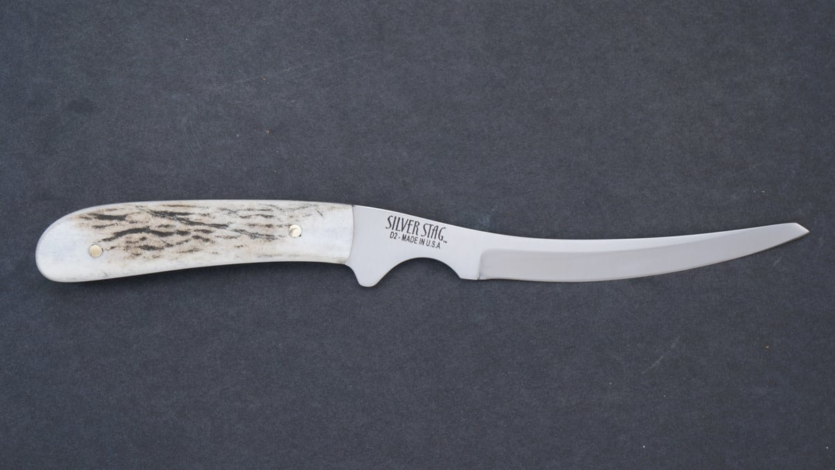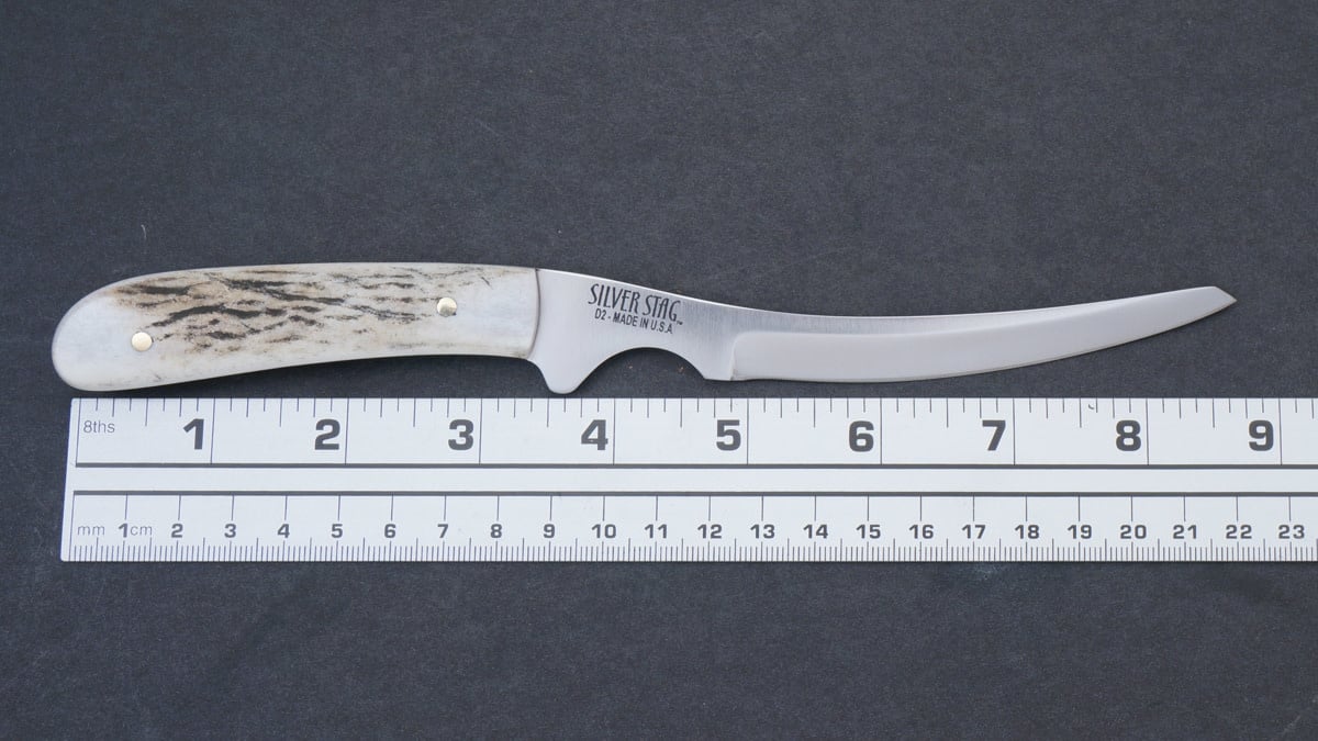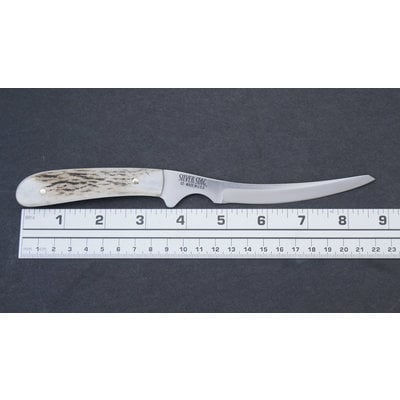 Features a 4.25"”, handmade D2 Steel Blade (8.75"” Overall), built in full tang construction with Whitetail Deer Scale Handles.