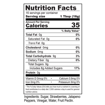 Ingredients: Sugar, Strawberries, Jalapeno Peppers, Vinegar, Water, Fruit Pectin