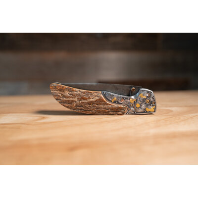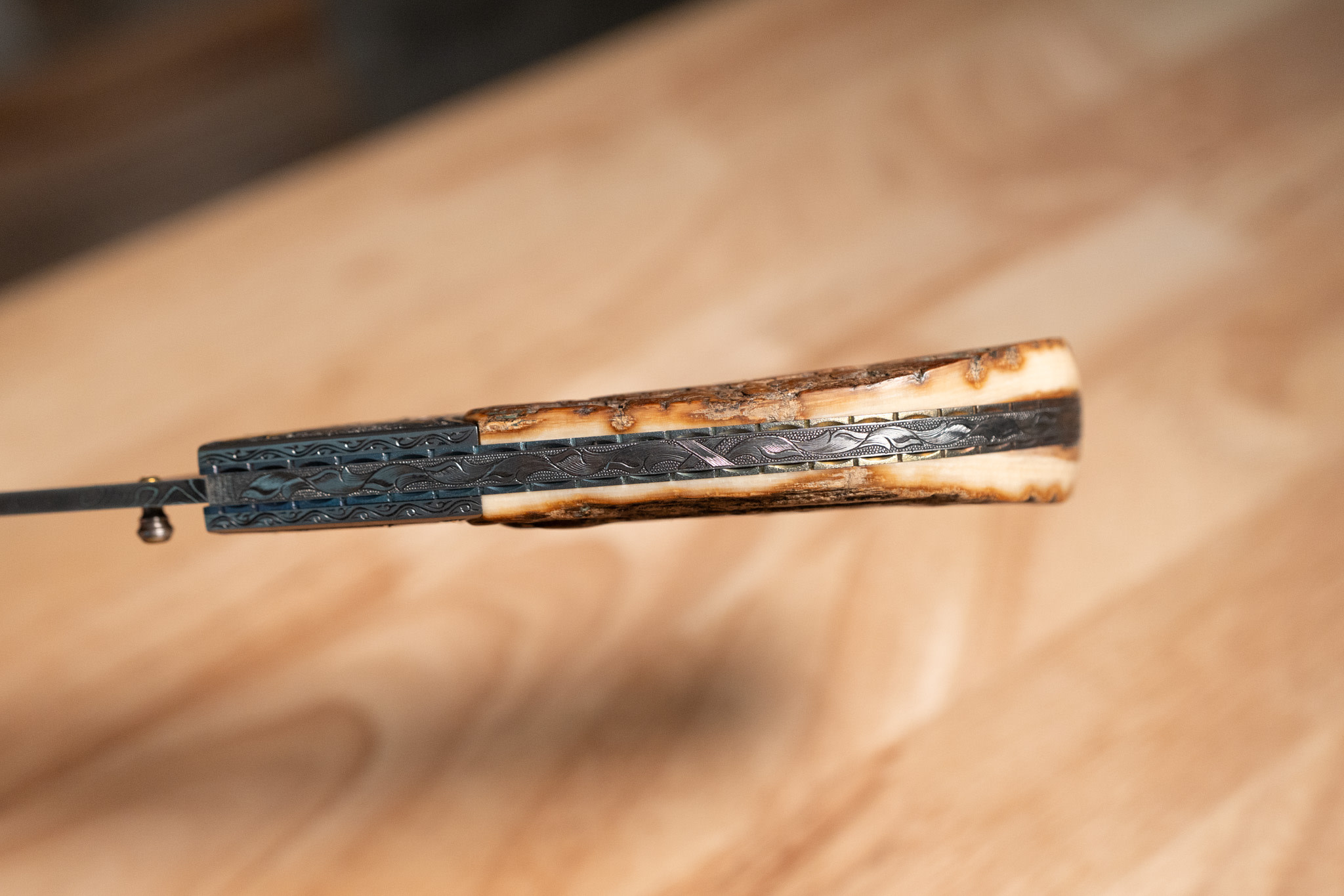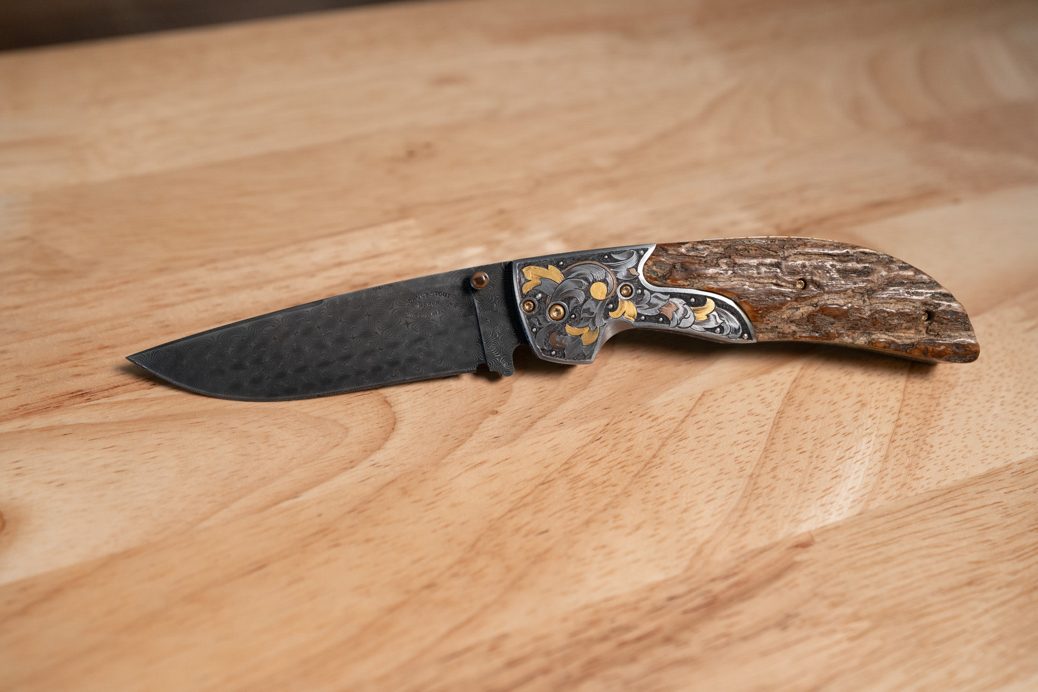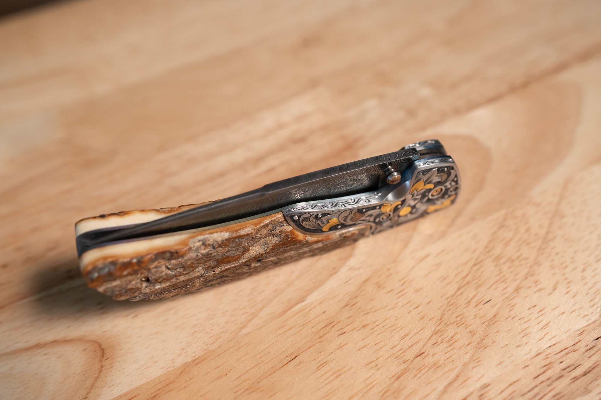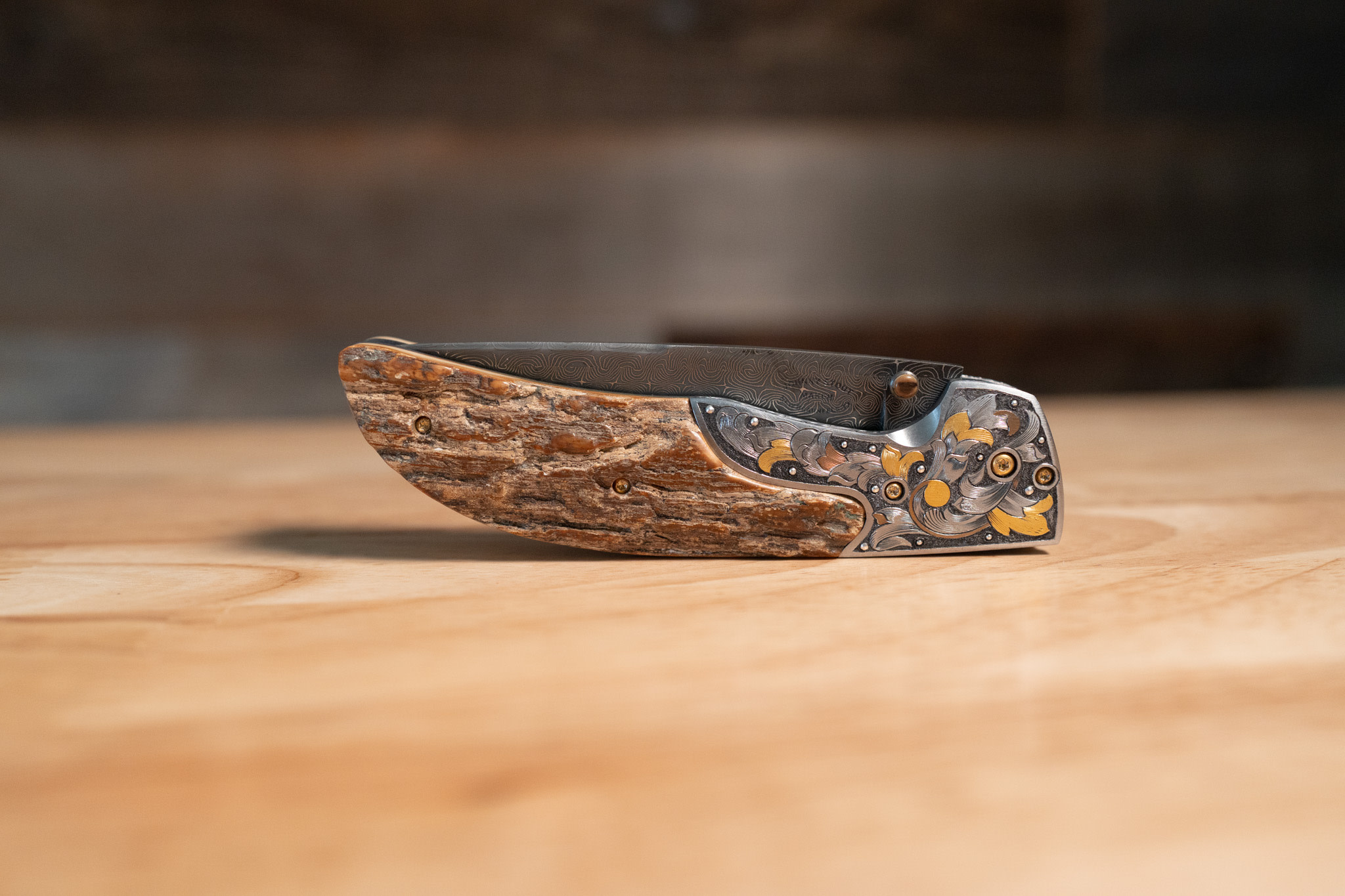 Johnny Stout - Compadre Folder, Turkish Twist Damascus, Mammoth Ivory, Hand engraved by Dale Bass 24K gold.