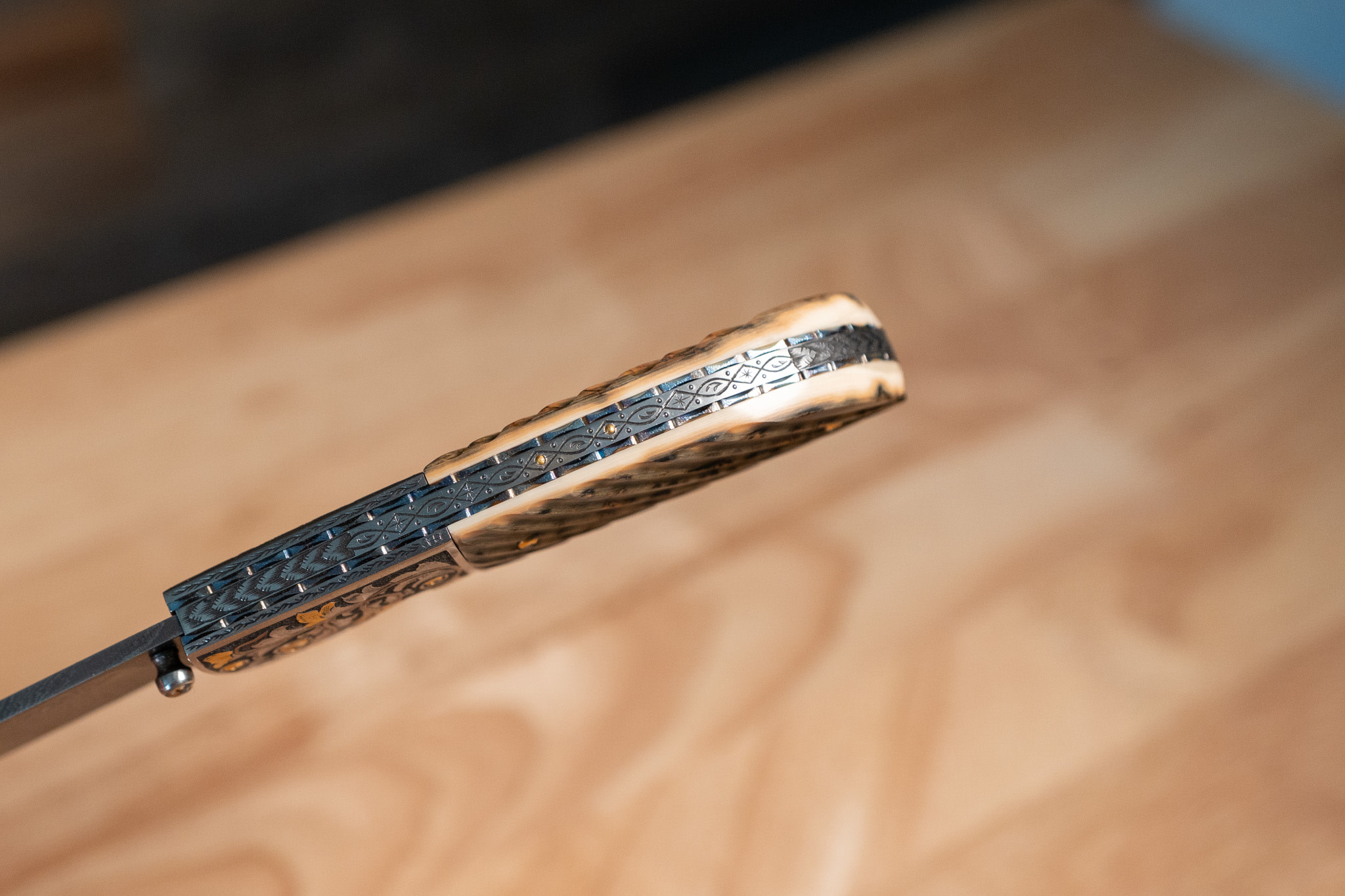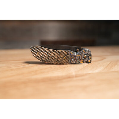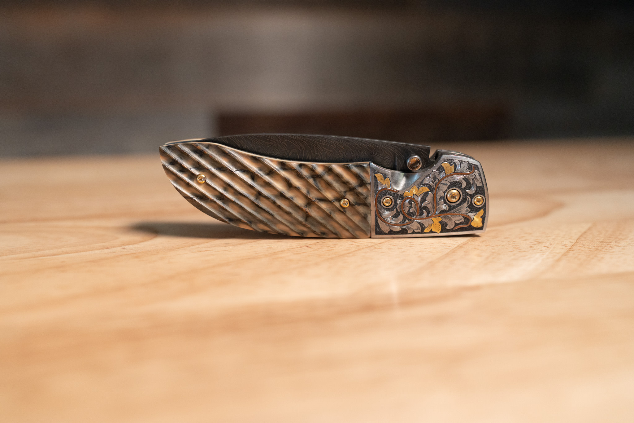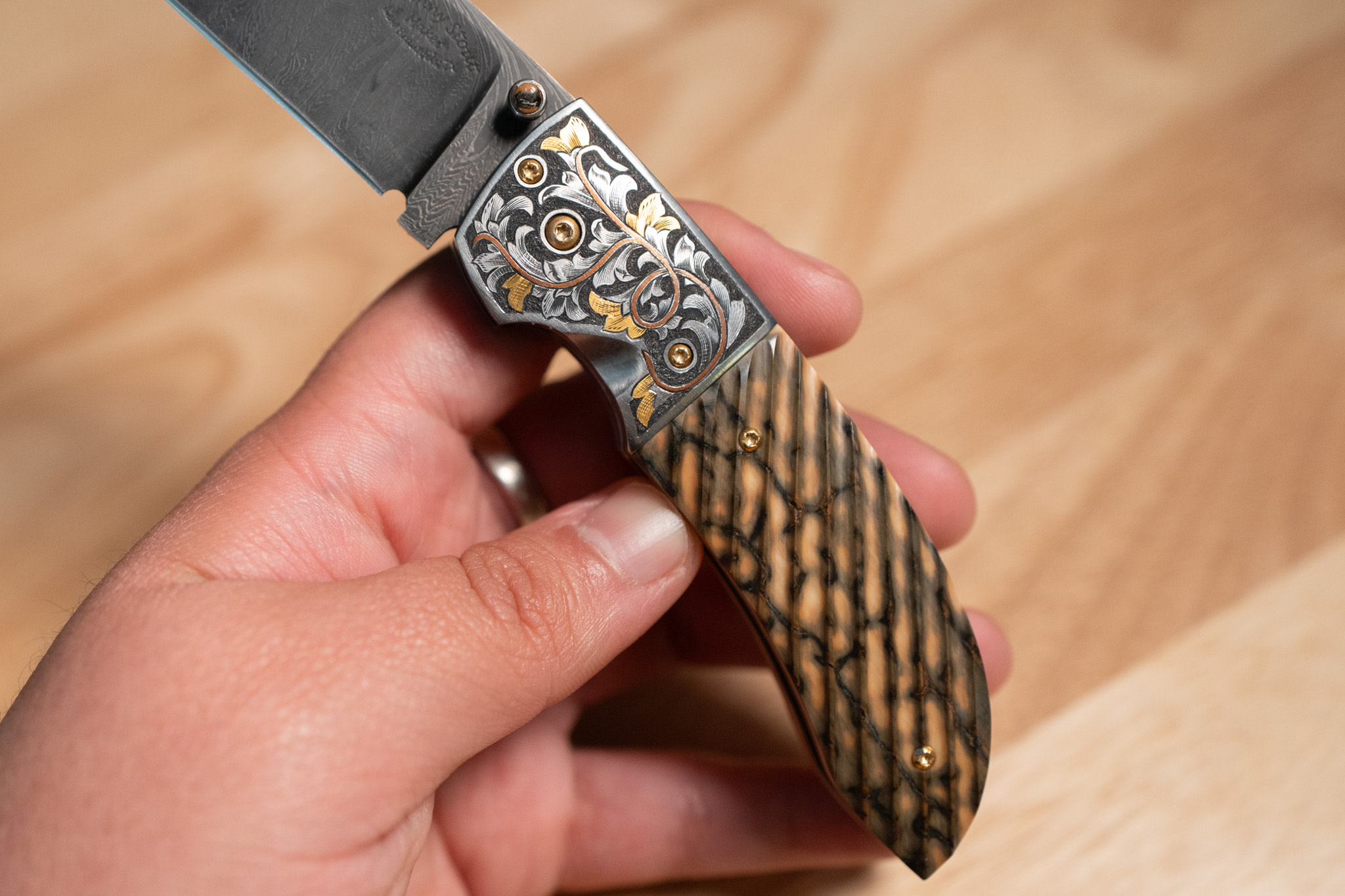 Johnny Stout - Front Pocket Folder, Feather Damascus, Fluted Mammoth Ivory, Engraved by Shane Carter w 24K Gold.