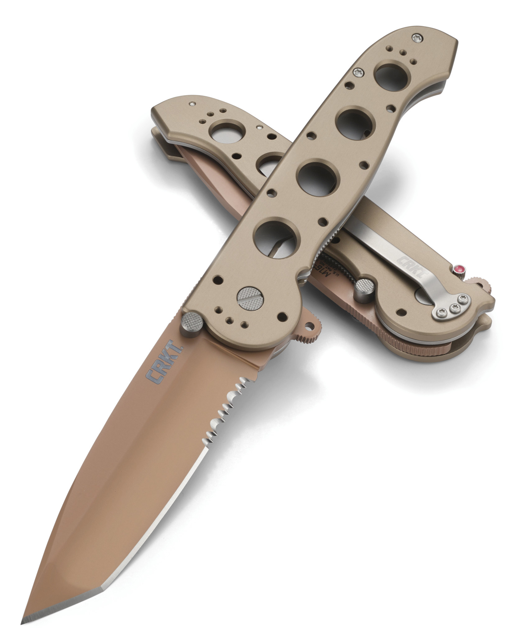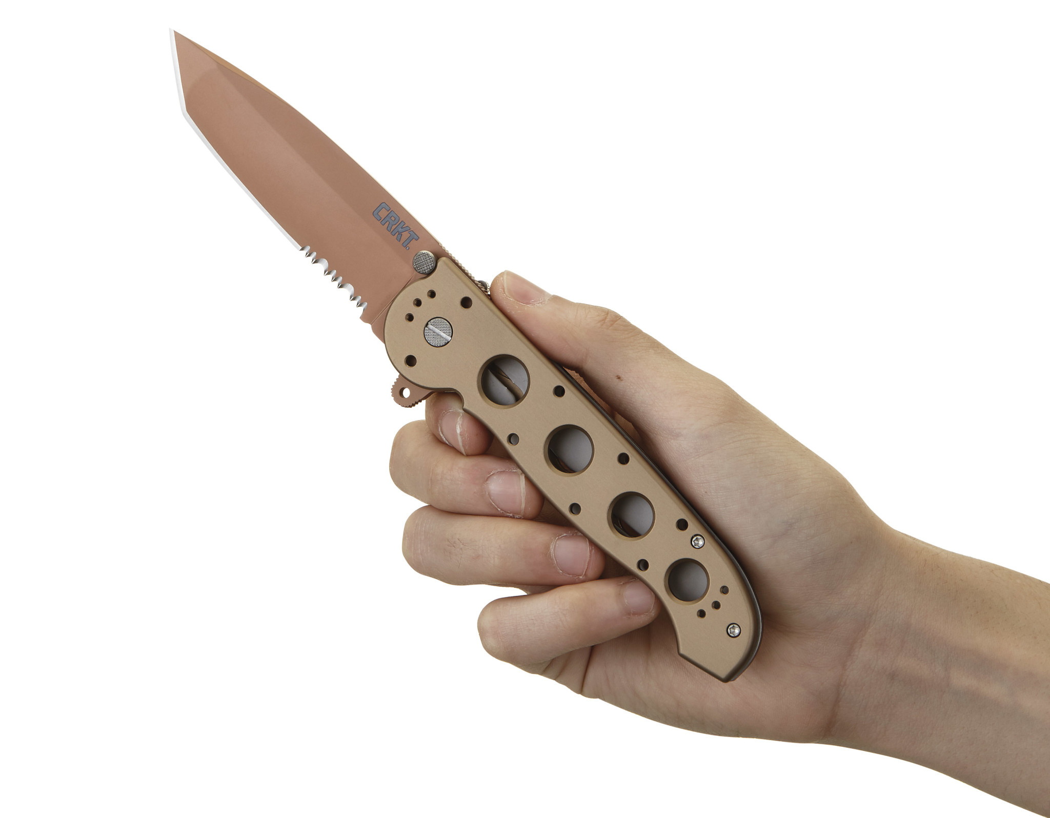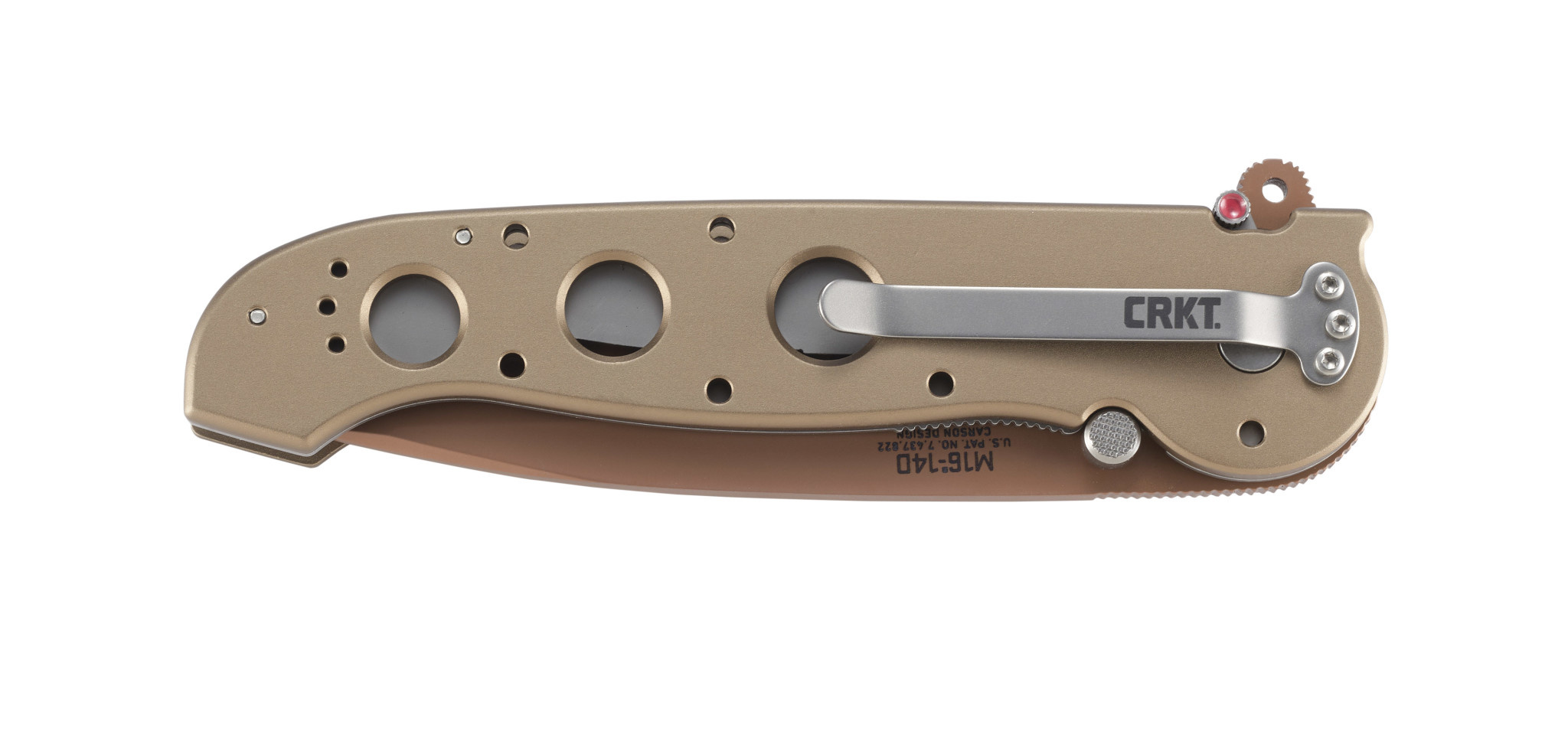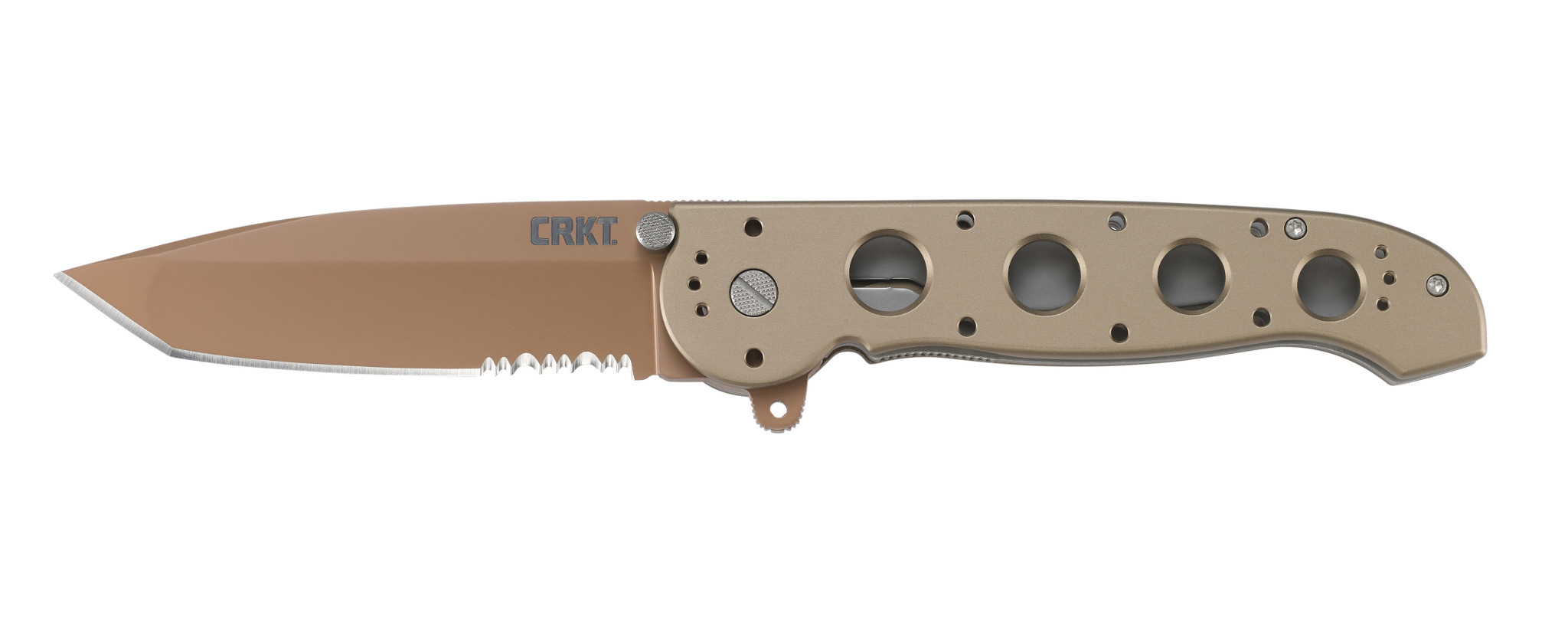 The contoured handles of 6061 T6 aluminum are hard anodized Desert Tan. The 3.875" (98 mm) AUS 8 stainless steel blade, chosen for edge retention and durability, receives a highly corrosion-resistant Desert Tan non-reflective titanium nitride coating.