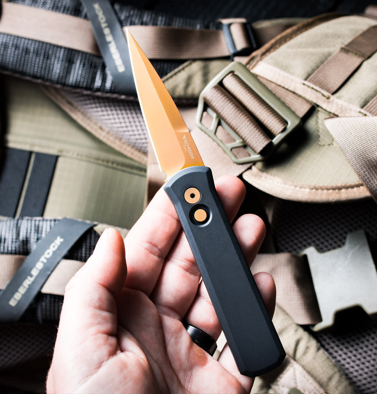 Pro-Tech - Godson, Black Aluminum Handle, Tan PVD Blade, 154CM Steel