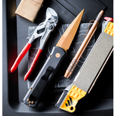 Godson - Black aluminum handle, Tan PVD 154-CM blade, matching Tan PVD hardware, black clip.