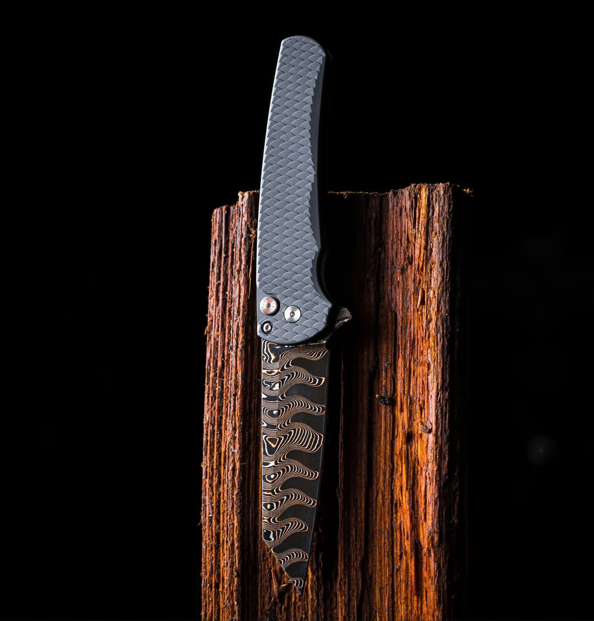 ProTech Malibu Custom, BakerForger Coppermai Damascus, Aluminum Dragon Scale Handle