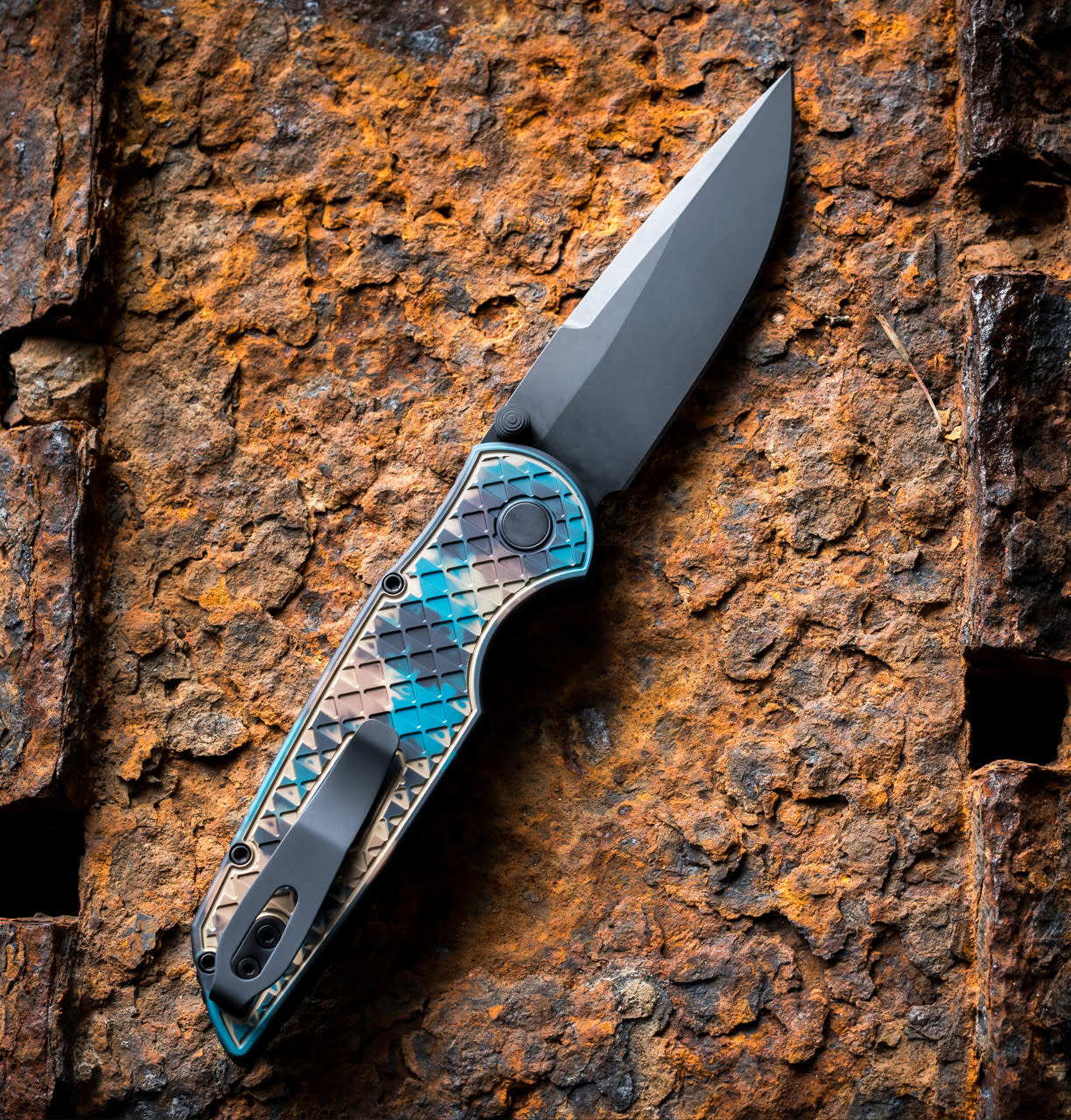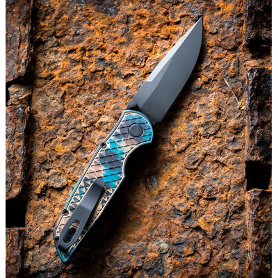 TR-3 Integrity Thumb stud Manual - Relic textured aluminum handle, "SHIPWRECK" anodized, DLC black MagnaCut blade with DLC black double thumb studs , black lip pearl button, black wide deep carry clip.