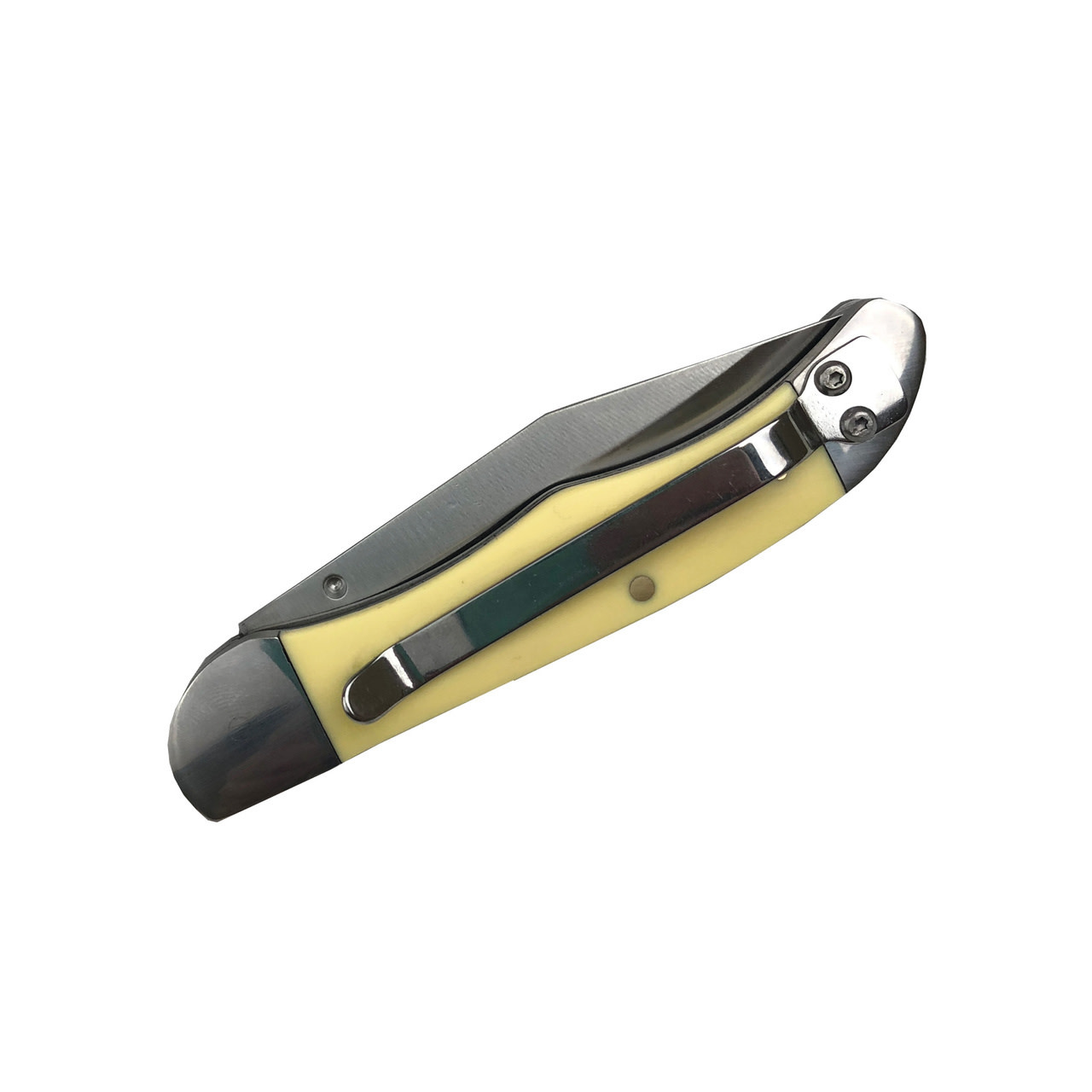 Hearty and ready to get the job done. Featuring a 1065 satin finished carbon steel blade and yellow Delrin handle, the Roper Pecos Liner Lock is ready for the task at hand. It also has a pocket clip with an easy opening thumb-stud.