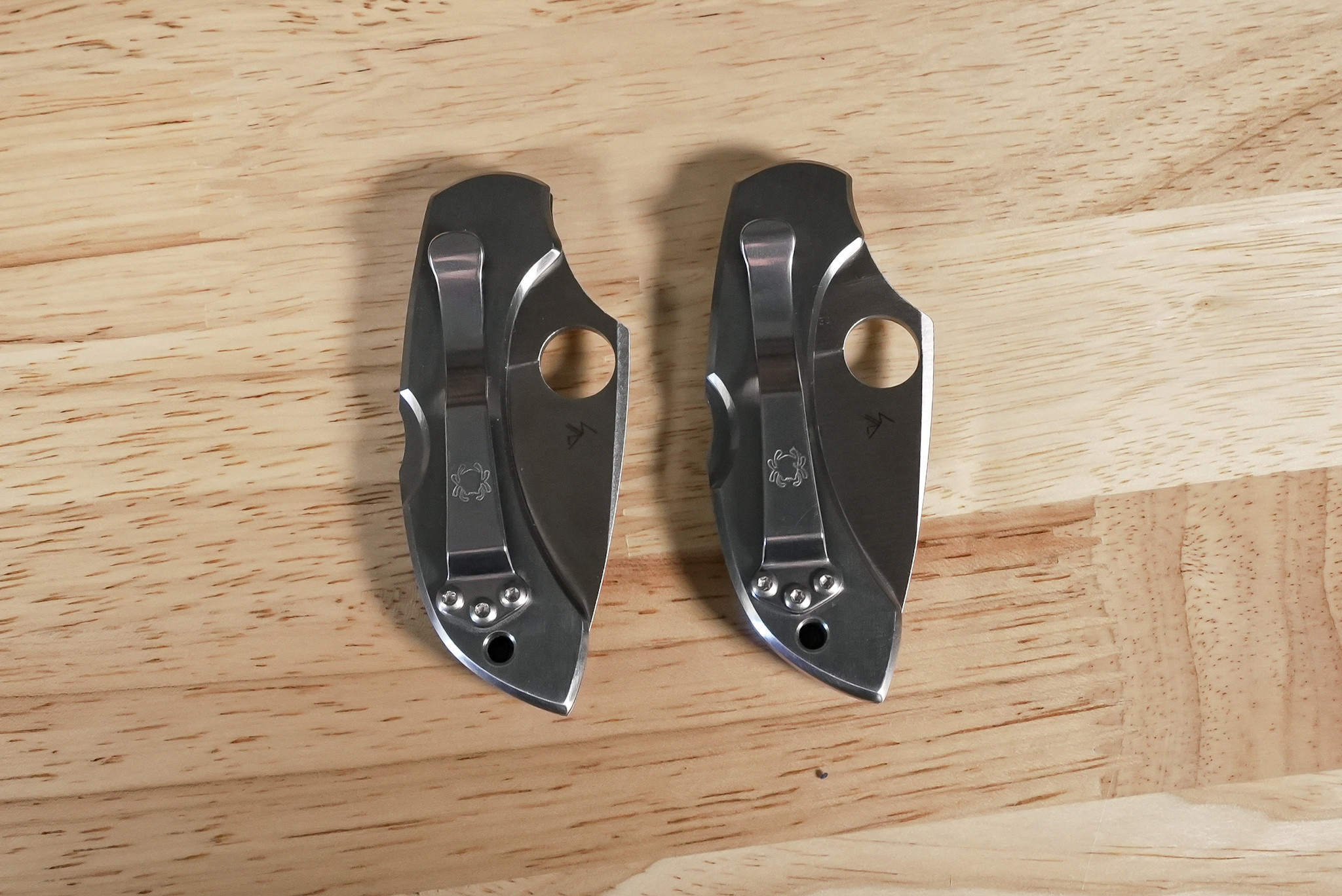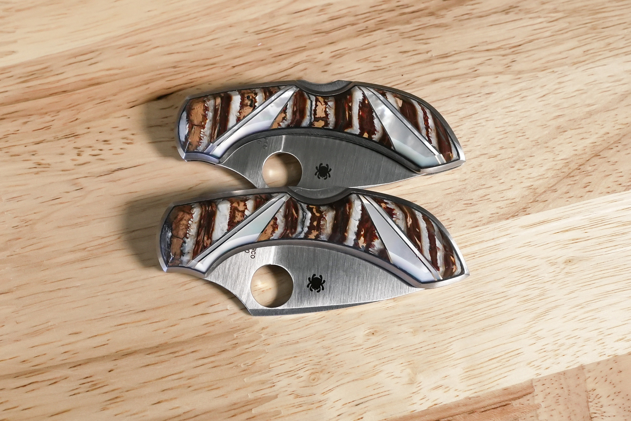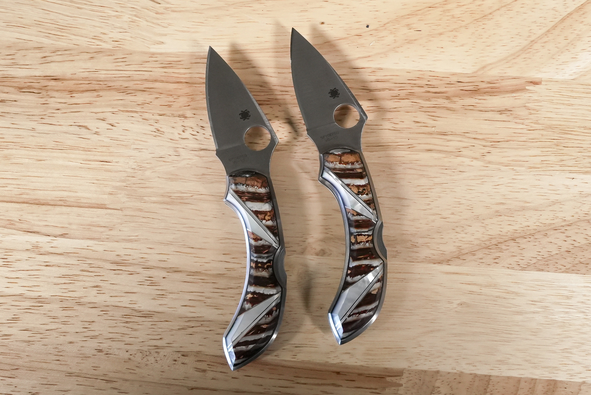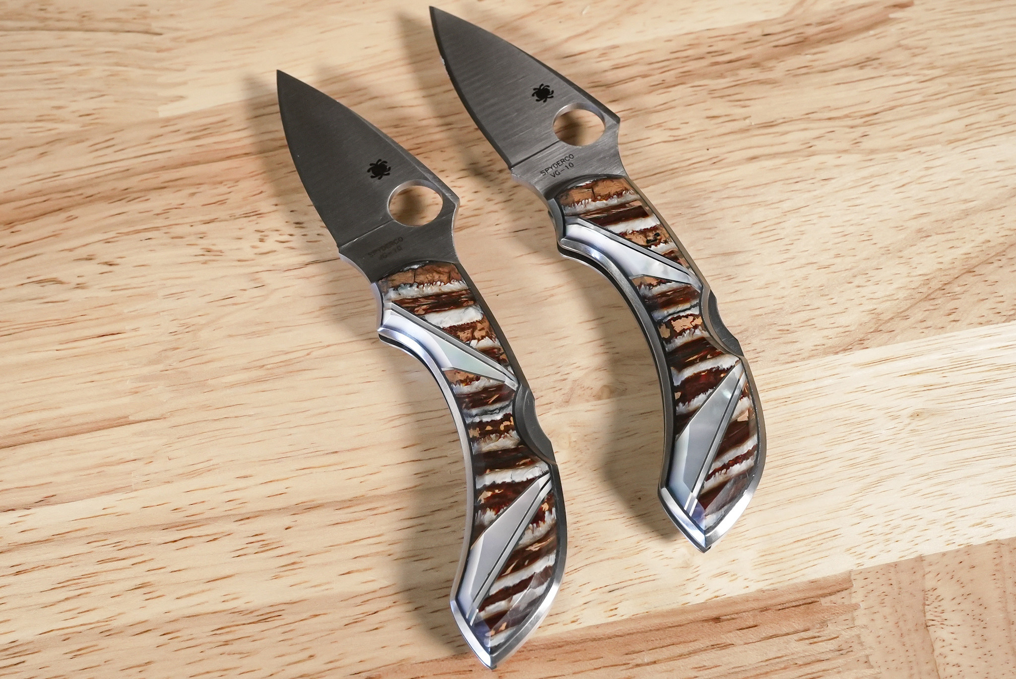 This is a Spyderco Dragonfly with a mammoth tooth handle made by the craftsmen at Santa Fe Stoneworks of Santa Fe New Mexico. There can be some variance of the natural handle material so give us a call and we will be happy to send current photos.